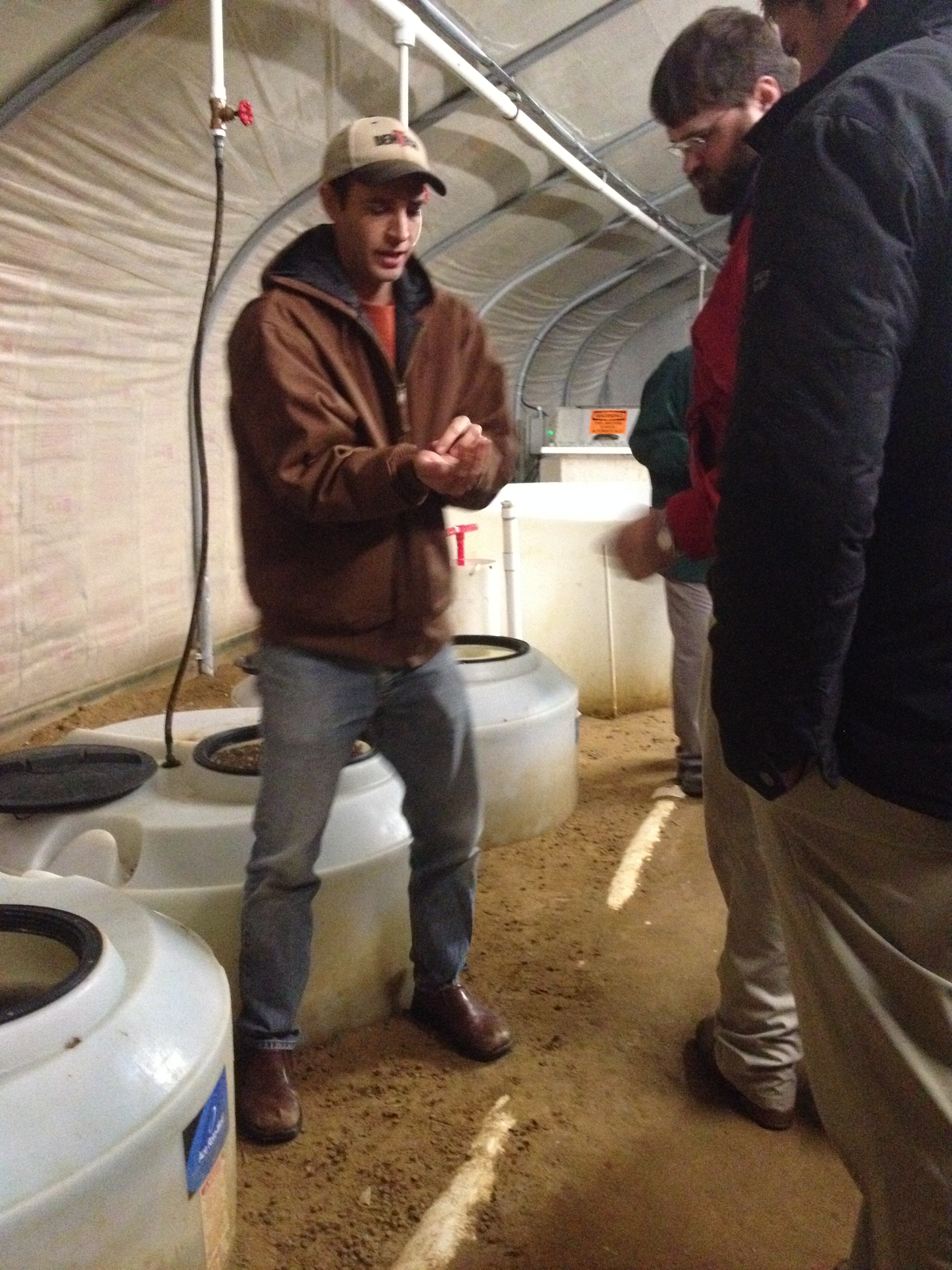The town of Quinby resides in Accomack County, the upper half of Virginia’s portion of the Eastern Shore. The population as of the 2010 US Census was 282, nestled among flat fields and waving sea grasses. On the eastern border of Quinby, Mid-Atlantic Aquatic Technologies (MAAT) has been perfecting fish farming with Black Sea Bass, native to Eastern U.S. waters, noted for their firm texture and delicate flavor. Chris Bentley is the Farm Manager with MAAT, and has been involved in aquaculture for 14 years, starting at the University of North Carolina Wilmington. He became interested in Black Sea Bass while at UNC-W, which led to a partnership and eventually the formation of his current job with MAAT. Chris is gentle with a gracious demeanor, and led the VALOR Class II fellows around the facility and land while we gained immense details regarding his pursuit of the commercialization of Black Sea Bass.