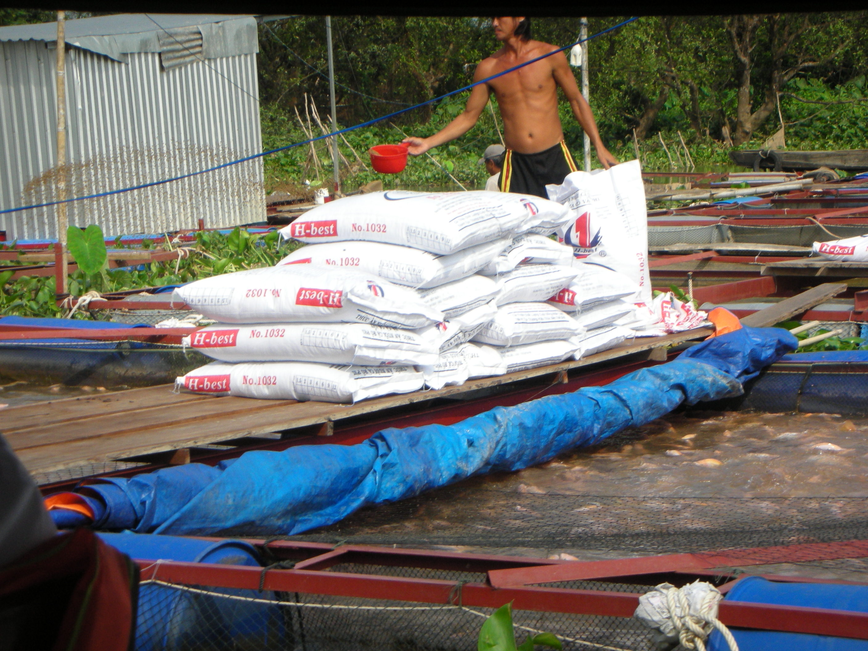 We then went by a floating fishery. This is where they raise and keep live fish in the river and raise them until they are large enough for harvest. Most of the farm was catfish, but there were some other types like sea bass and tilapia that they were raising for customers.