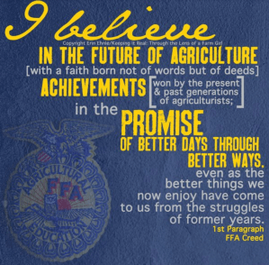 FFA members know those words as the introduction to the FFA Creed penned by EM Tiffany nearly 100 years ago. Years separate today’s agriculture practices from Mr. Tiffany’s world. Years separate you from when you first learned those words. What cannot separate you from those words is the essence of what they mean, what values you learned, the impact of those words on how you live your life as an agriculturist.