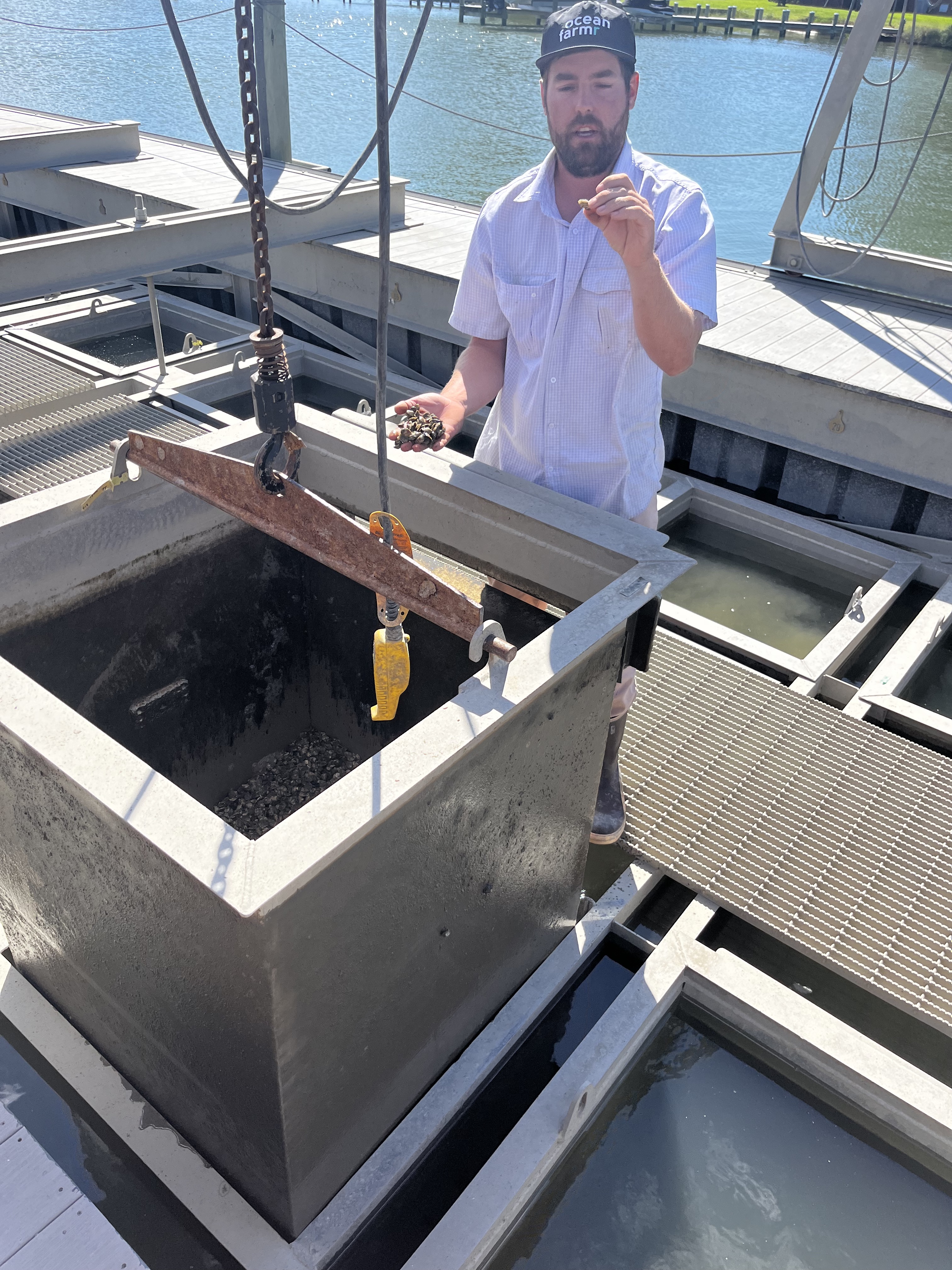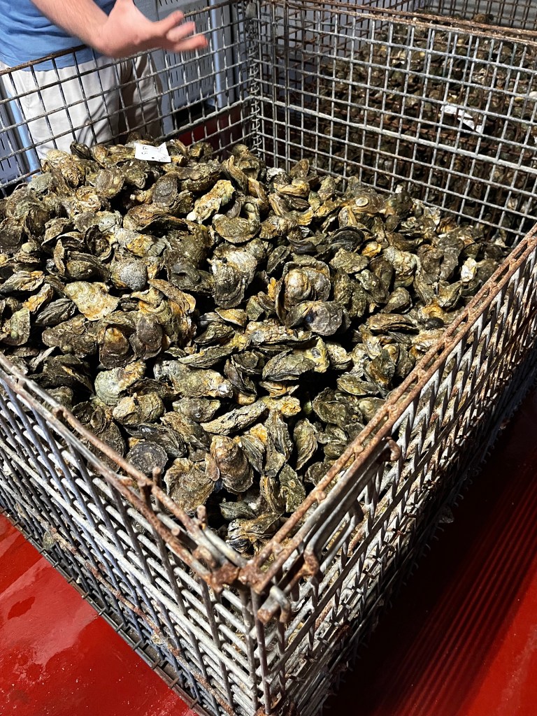 Oysters, though – I just can’t. I tried the second oyster of my life, this time fried – I’m not sure I’ll come around on this one. However, I find the oyster industry fascinating. We visited Rappahannok Oysters, where they farm oysters from larvae to dinner plate in cages in different parts of the bay. The different locations affect the flavor of the oysters, depending on the wishes of their customers. It takes two years to grow tiny little larvae to full-on oysters for market. I joked that it was similar to growing beef in that respect. We also visited Kellum Oysters, which harvests their crops from the river beds in the bay. Here, we got to see the processing end of this booming industry.