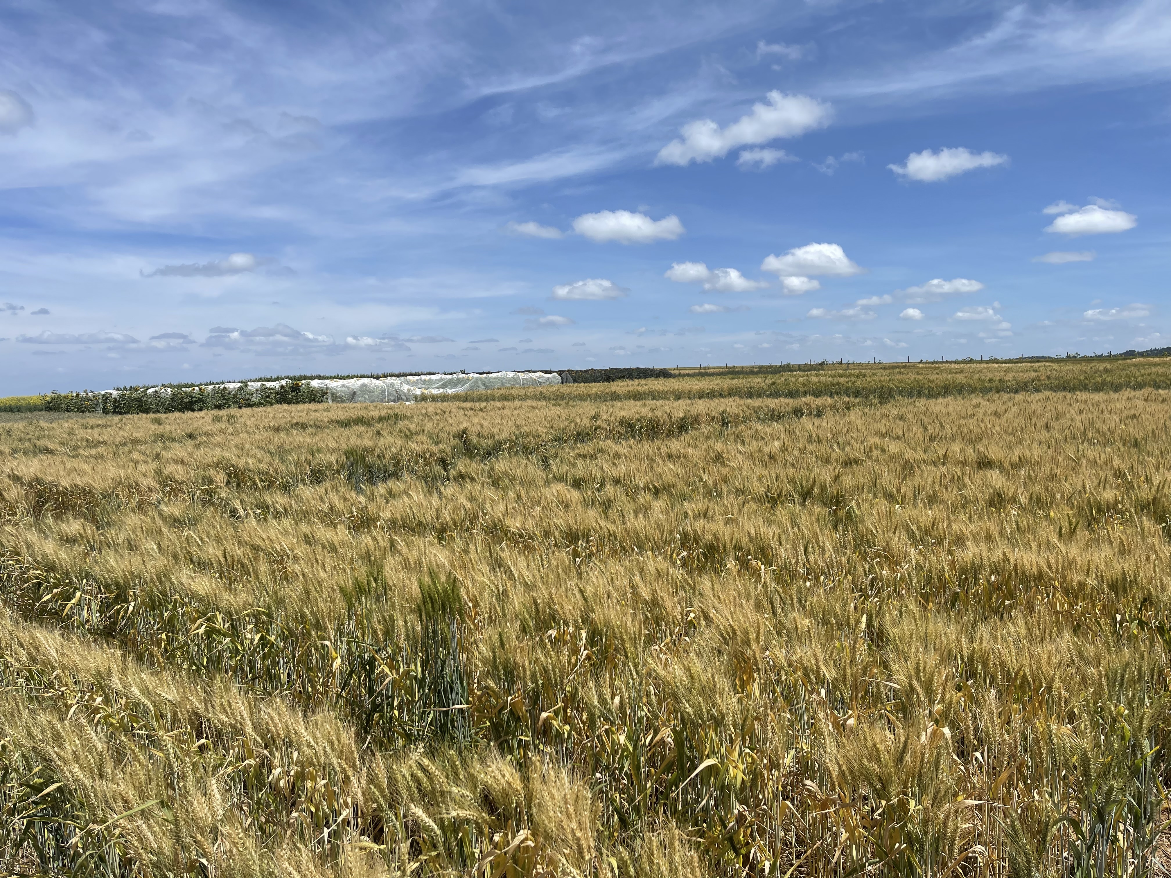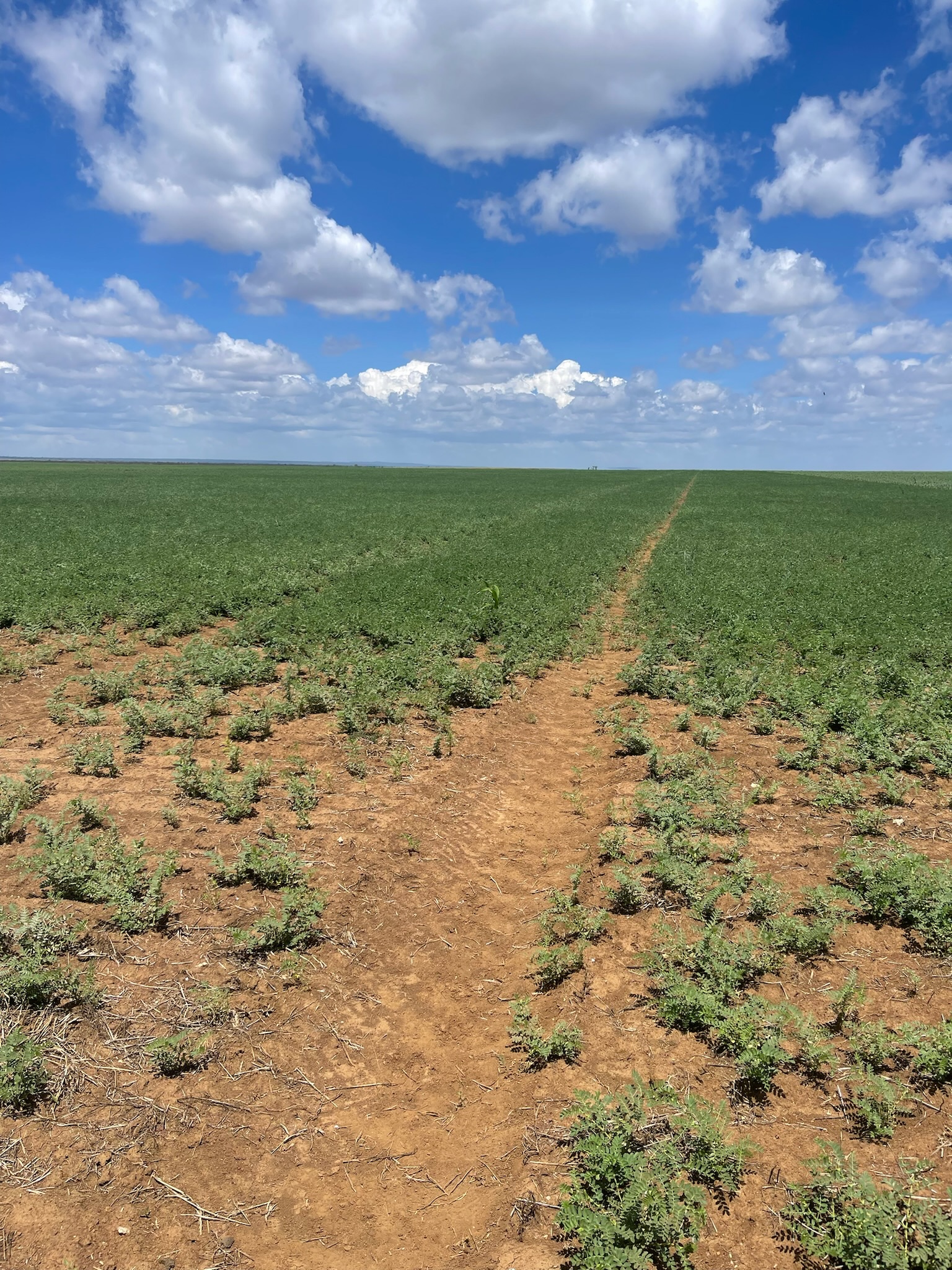 The second operation we visited in this area was a 6,000 acre grain operation. Contrasting to the cattle operation, this entire farm was fenced to protect the crops from wildlife. Here they grow corn, wheat, barley, canola, peas, chickpeas, sunflowers, and sorghum using a controlled traffic system. With the use of GPS, all field operation done with equipment always drove on the same tracts. The wheels on all of the tractors and equipment were set at 3 meters and each implement was 30 feet wide, except for the sprayer which covered 90 feet.