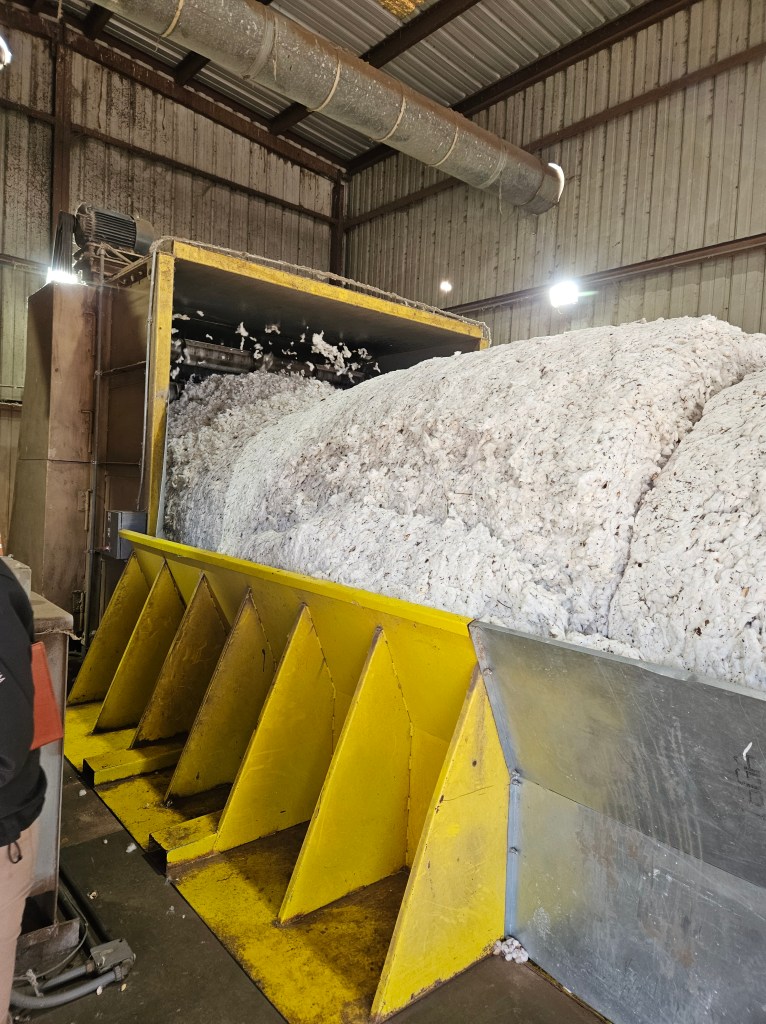 Our next stop was Commonwealth Gin where we learned about all things cotton. The family business began in 1992 after identifying a need for more ginning hubs in southeastern Virginia, where cotton could be processed and prepped for export. It was great to hear from the owners and see them speak highly of their agronomist, Johnny Parker, recognizing how he helped Virginia cotton acres grow since the beginning of his tenure. I’ve witnessed the leadership Johnny brings to the local industry from tackling research questions with the local AREC to providing daily updates on the radio and recommendations to producers. I was able to follow along on their explanation of cotton production and growth, but, when we got to the ginning process and warehouse, it was a whole new world. When running full speed, the gin can process about 30 bales an hour, or about 15,000 lb of lint! Not only is turnout- or how much lint is actually processed from the harvested material- important for the end product, but so is the quality of the lint. The gin employs staff who look at the futures markets and contracts to sell the lint, eventually distributing it worldwide. Just like the peanuts, the sheer size of warehouse storage was impressive. Additionally, when harvested material is being processed, there is fine trash, but also the seeds as a byproduct. Seeds can be stored (another massive warehouse) and used in other industries, so waste is reduced in this regard.